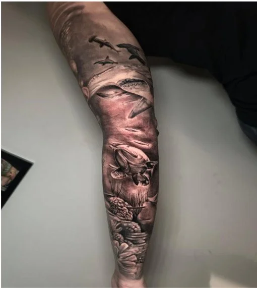The ocean offers limitless inspiration for realism. Waves crashing with motion or divers surrounded by a diverse aquatic life can bring the scenes vividly to life. A sleeve, back, or calf placement provides the space to stage the entire ecosystem.
