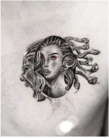 Unlike more aggressive and bold Medusa designs, Bernini’s version appeals to those who value vulnerability as a form of strength. With rich shading and texture, this tattoo design symbolizes survival, transformation, and the complexity of emotions. Most people prefer getting it on their arms to always remind them that even the strongest of us have it hard.