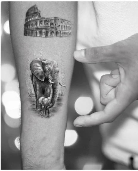 For instance, one of our recent works combines the Colosseum’s magnificence with the image of an elephant. Both these designs are symbols of power and endurance that pay homage to Rome’s legacy while carrying deep personal meaning.