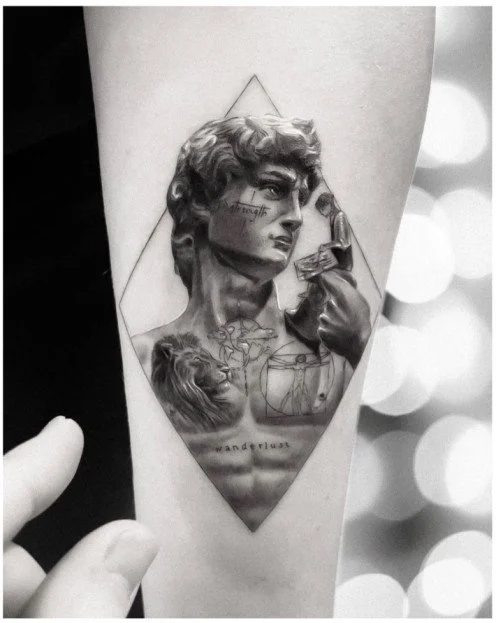A David tattoo symbolizes courage, confidence, and the pursuit of greatness. It resonates with history enthusiasts, as well as with those who appreciate the acceptance of the realistic imperfections in humankind.