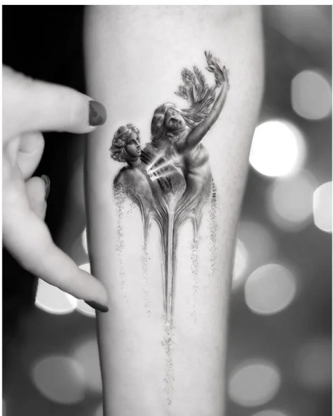 In tattoo art, such as this one, the myth is often reinterpreted with dramatic realism. It shows Apollo extending his arm, and Daphne’s form dissolving into a laurel tree.